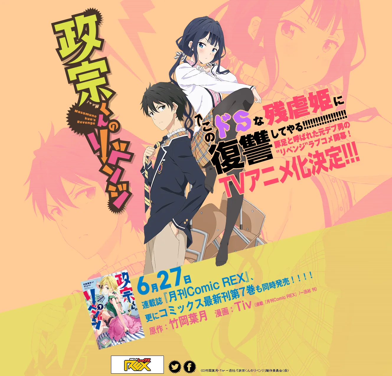La revista Comic Rex de Ichijinsha anunció que el manga “Masamune-kun no Revenge” de Hazuki Takeoka y Tiv tendrá una adaptación animada.