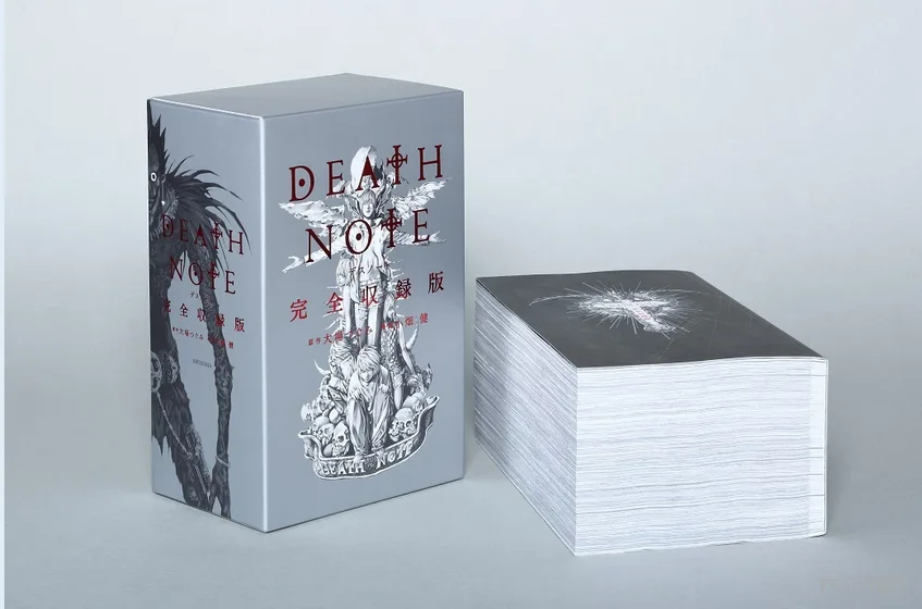 Dicha edición que pueden ver en imágenes, recopila los 12 volúmenes originales de la historia, así como el especial publicado en noviembre de 2008, el cual celebraba el estreno de la tercera película de Death Note, en 2400 páginas.