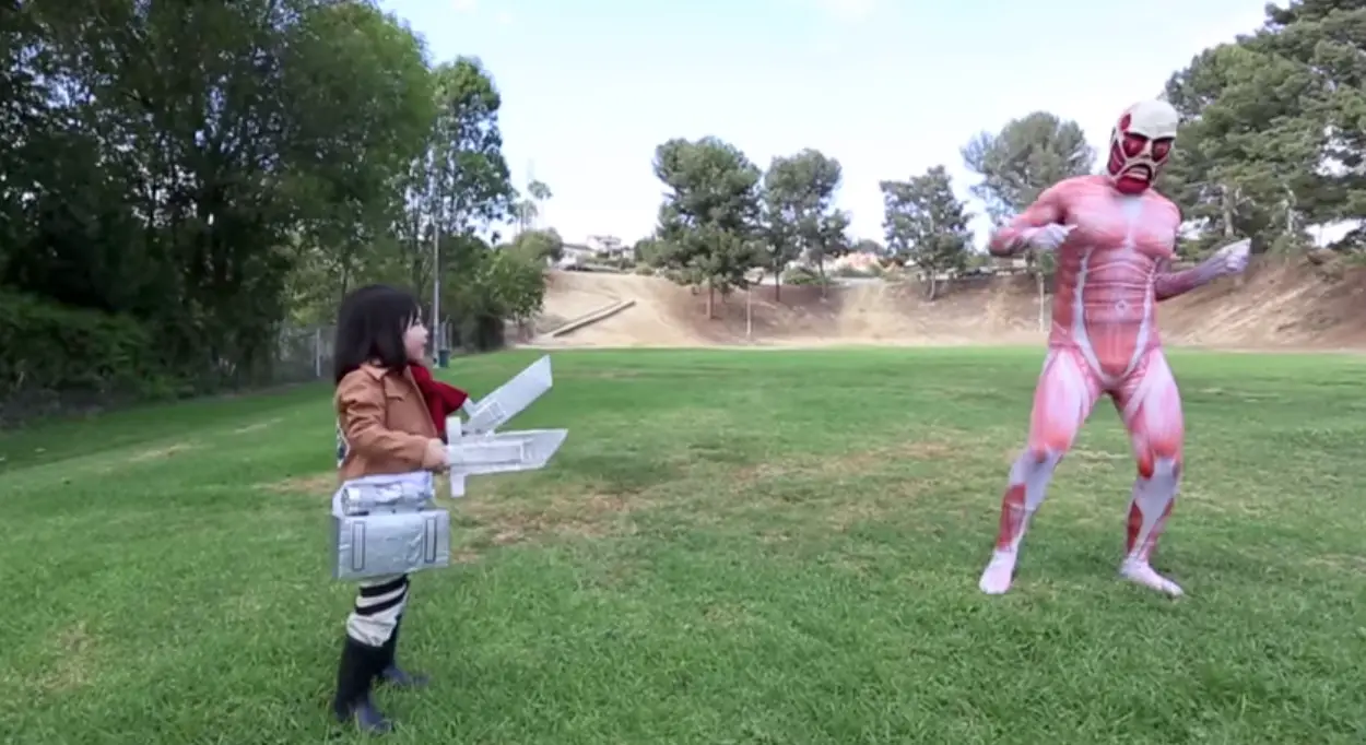 ¿Ven? poner a un hombre en un traje entallado y una mascara de Titan Colosal a pelear con una Mikasa de 4 años puede ser de lo más tierno del mundo.